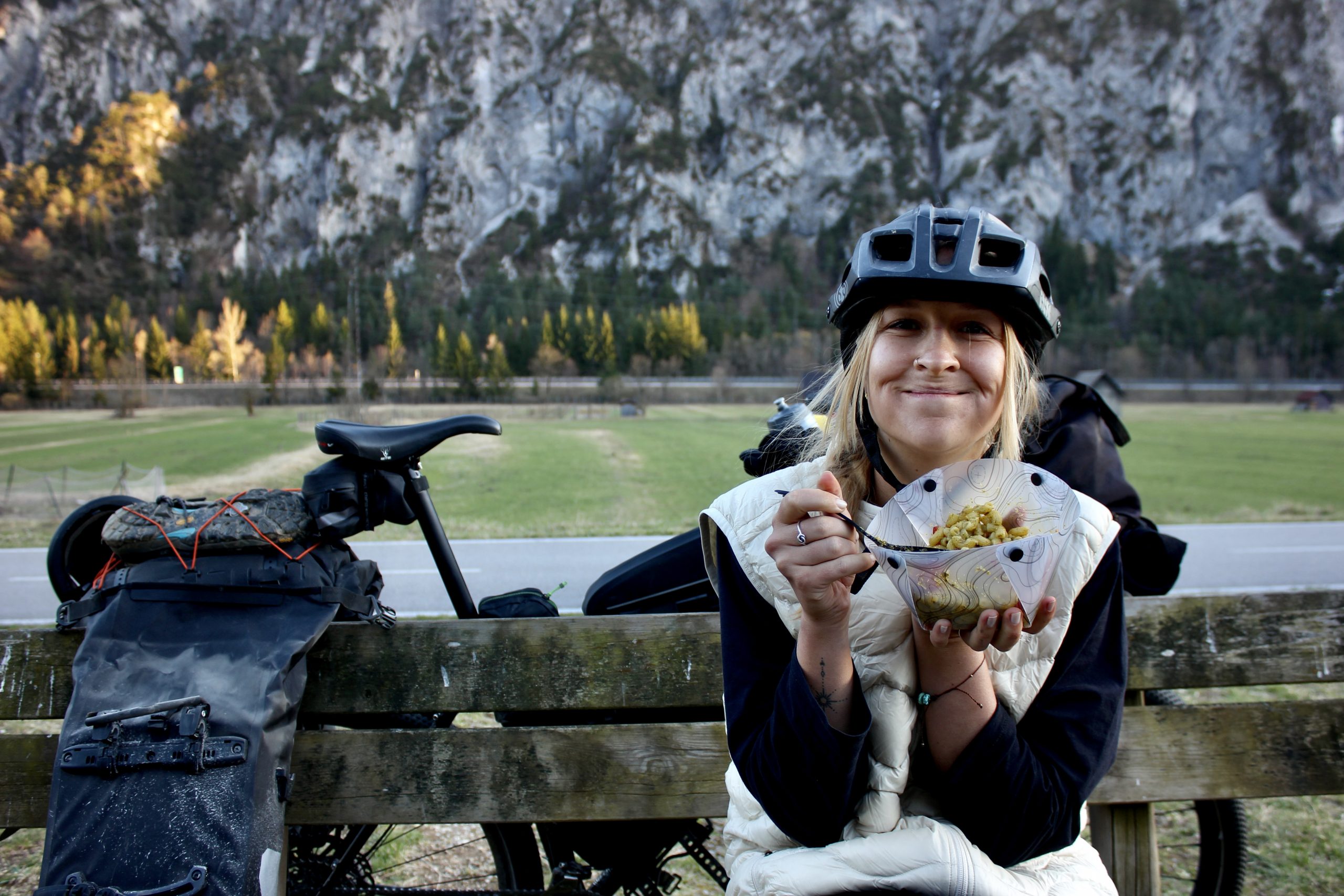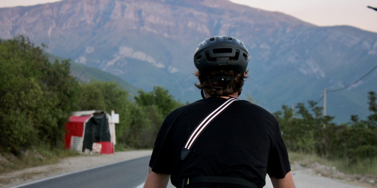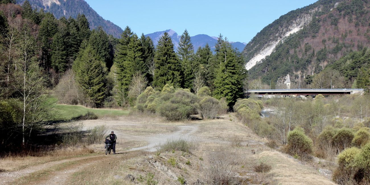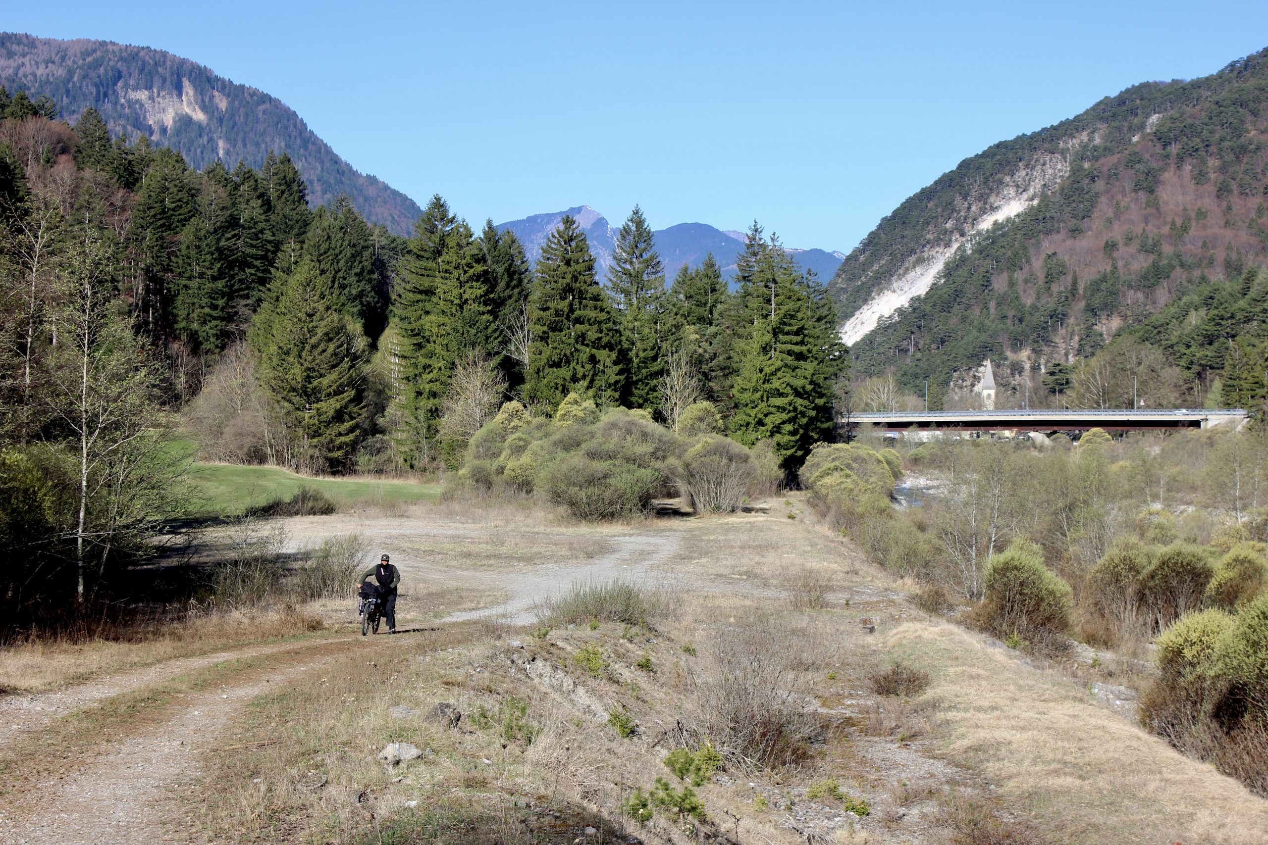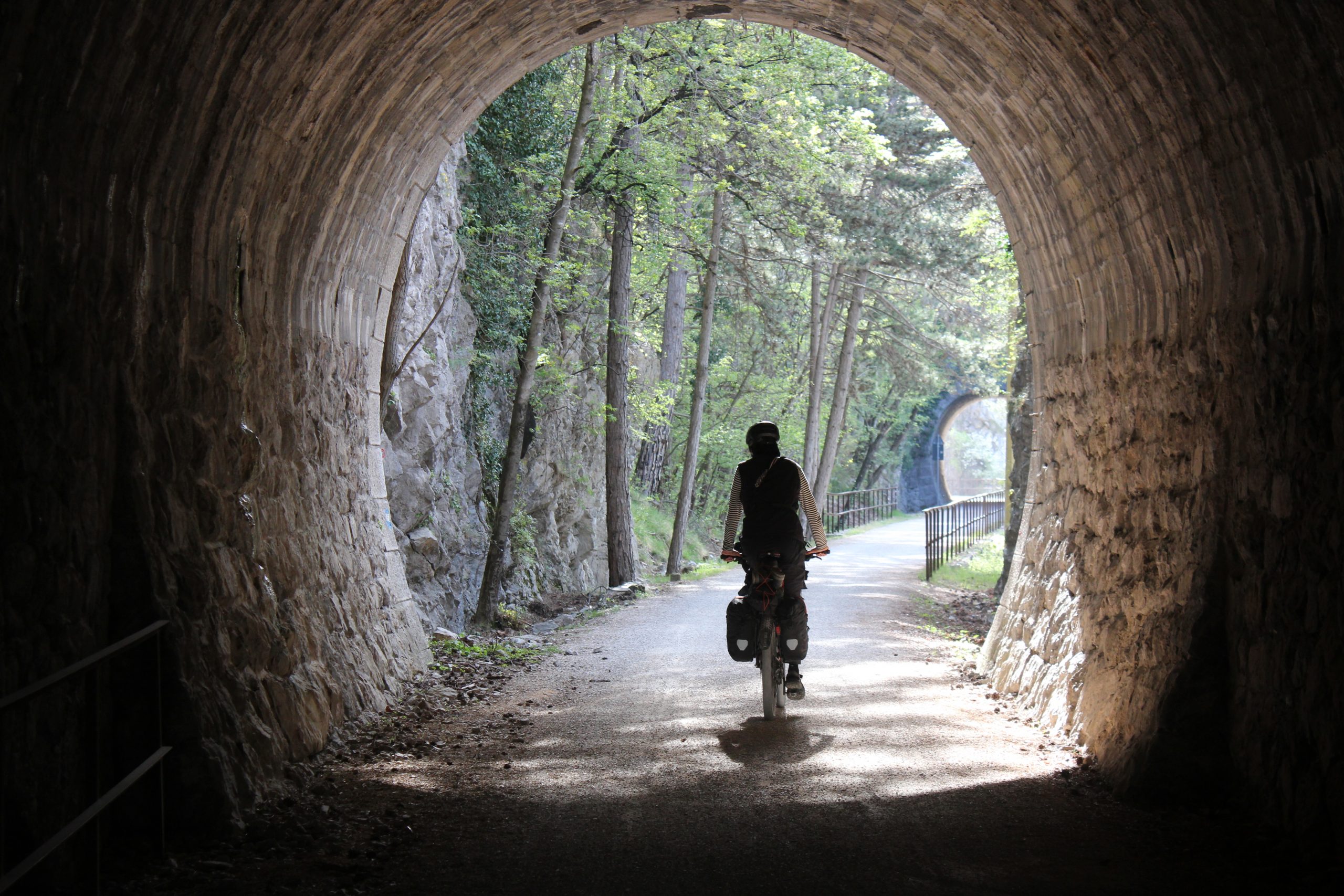 Bikepacker durch Brücke